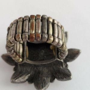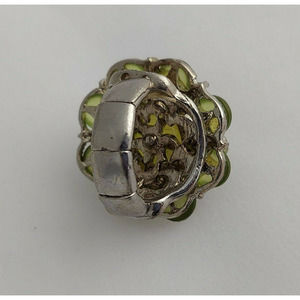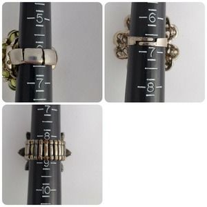 Condition: 2 missing stones on pointed black flower ring but barely noticeable; some signs of wear, light scratches and tarnish may be present. Most noteable on the black stretch ring. The strings on the green ring are tight, the black ring strings are looser and stretches from a size 6 to an 8.
