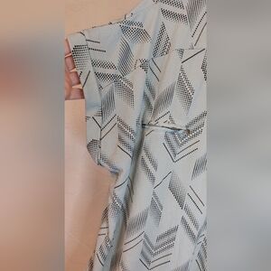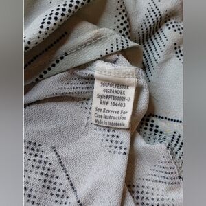 V-neck with Gold zipper front, short rolled sleeves, two fake pockets on front. It is stretchy.