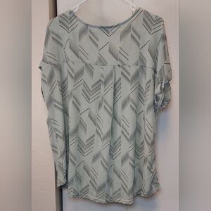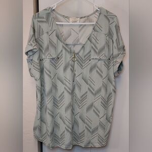 Flower & Feather Green Size 1X Top V-Neck Front Gold Zipper Blouse Short Sleeve