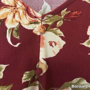 Flower & Feather Maroon Blouse Floral Print V Neck Puffy Sleeve Buttons Women L