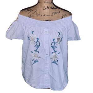 Introducing a stunning blue peasant top from the brand FLOWER AND FEATHER. This tunic style blouse is made from 100% cotton material and features a beautiful embroidered flower pattern, perfect for those who love all things floral. The off the shoulder neckline and pullover closure make this top easy and comfortable to wear, and it can be worn over the shoulder, while the size L fits true to size for a regular fit. It measures 21in pit to pit and 20in shoulder to hem.