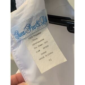 This beautiful dress from Swea' Pea & Lilli is perfect for any formal or party occasion. The dress features a round neckline, zip closure, and an A-line style with a long dress length. It is made of organza fabric with lace, layered accents, and a bow. The dress is lined and has a solid pattern in white color.