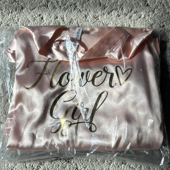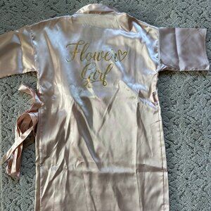 NWT: Satin Flower Girl Robe with Metallic Script. Champagne pink/blush. Never used. Would fit a child from (S) 4-7 years old. Detachable satin belt. Fit for a little princess. Better photos on David's Bridal Shop Website.
