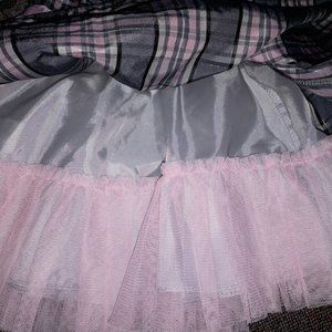 Wonderful details on this party dress. Exquisite contrast of gray and pink plaid. Attached grosgrain pink ribbon sash ties neatly in back and, at center-front, has a rhinestone buckle at the center of a flat bow. Built-in petticoat includes a ruffle of pink tulle that peeks out all around the hem-a very girly toach. Sleeveless for Summer-event comfort. In great condition, no pilling, spots, or snags. Easy care, inside out machine wash, can be tumble-dried, but I advise drip-dry to maintain color & keep fabric from wear. SFPF home.
