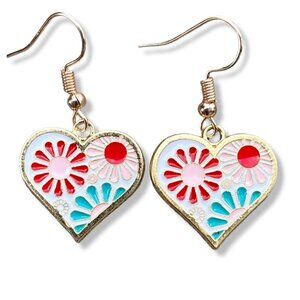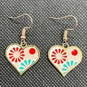 Feeling Groovy? These Heart Earrings will definitely be your go to fun pair to wear! The heart has a sixties vibe with a cute flower design. The heart charm are enamel and are lead and nickel free. Ear wires are gold plated copper, lead and nickel free.