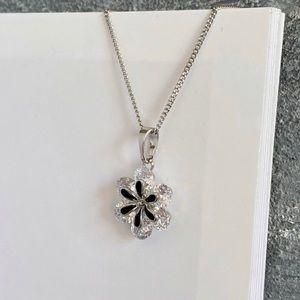 Flower Necklace Platinum Plated Elegant Flower Black Enamled Luxury Necklace