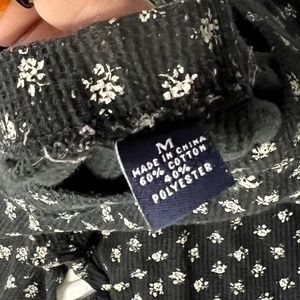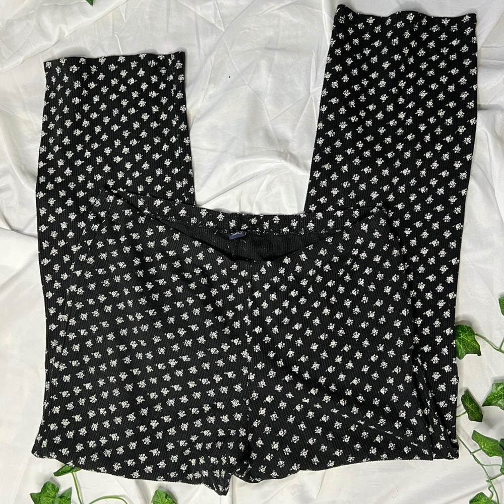 Black pants with white flowers pattern, size medium, stretchy waist band, comfortable, 60% cotton, 40% polyester, Condition 10/10, gently used
