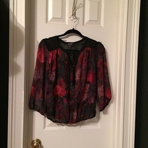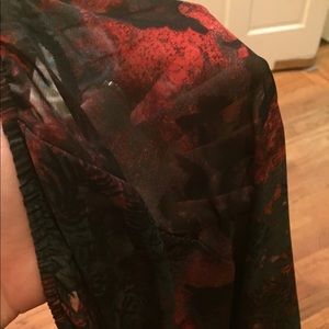 I have never worn this shirt anywhere! It's brand new and has black and red rose patterns on it. The shirt is a little see through!