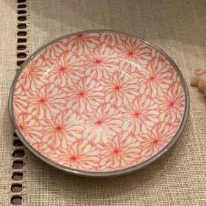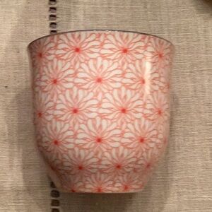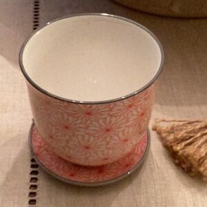 Mini Flower / Succulent Pot with Saucer, coral and white, drain hole,no chips, 3 1/4” wide x 3 1/4” wide.
