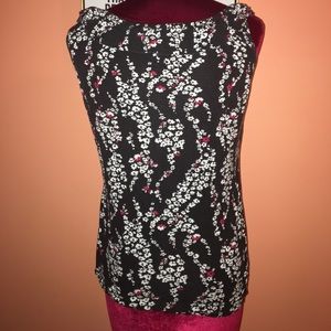 This is a motherhood maternity Tank but I literally had no idea till just now when I put it on the mannequin to photograph it 😂. Can totally be worn not being pregnant... or also pregnant! Black with red/white flowers. Cute ruffle around the neck and on the shoulders.