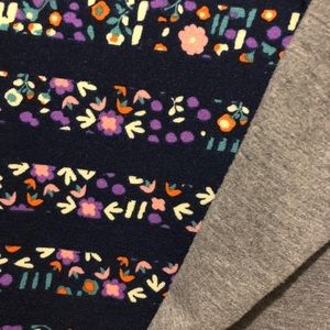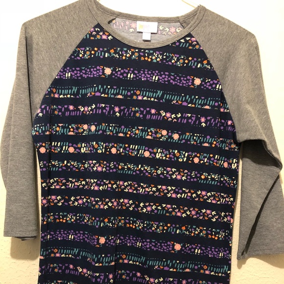 Super cute and casual flower garden Randy tee by lularoe. Navy blue background with heather grey sleeves and neck ringer. Worn once and washed per lularoe guidelines. Excellent condition.