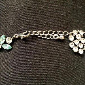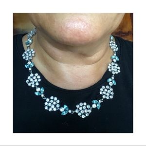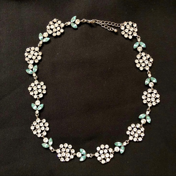Flower motif rhinestone necklace. 17 inches with 2 inch extender. Green leaves between the flowers. Good to excellent used condition.
