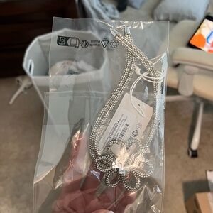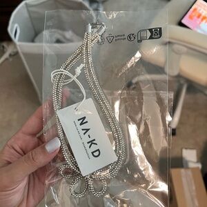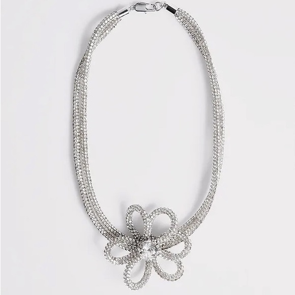 This necklace features rhinestone details. It has a layered, attached chain and a detailed, big flower shape. This necklace features a fish hook closure. Full length: 40 cm / 15.75 in. This necklace comes in silver-colored.