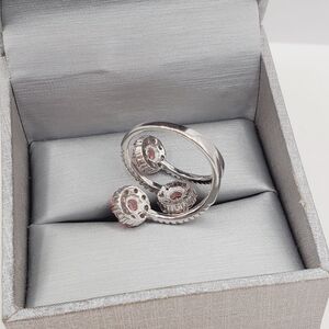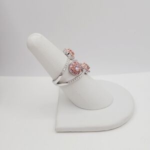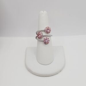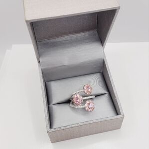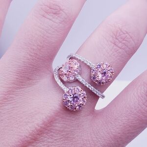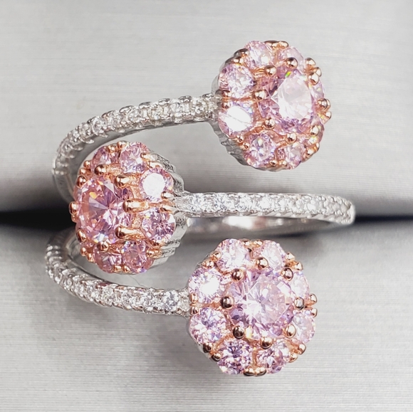 Feminine, radiant, and utterly captivating—this exquisite ring showcases a three-flower design adorned with brilliant pink diamond simulants, accented by sparkling white diamond simulants along the band. The soft blush tones of 18K rose gold over genuine 925 sterling silver create a romantic backdrop for the dazzling blooms, making this piece both timeless and fashion-forward.