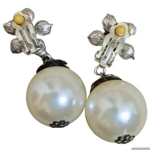 Flower Silver-Tone Crystal Faux Pearl Drop Clip On Earrings