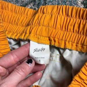Vibrant shorts featuring a floral pattern. Bright orange waistband adds a pop of color. Perfect sand volleyball shorts.