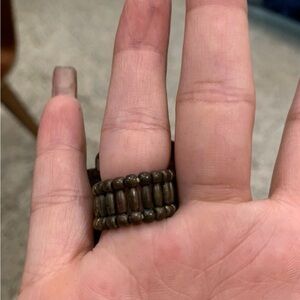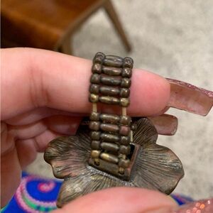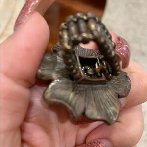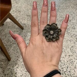 Bold flower ring with a central crystal. Features a bronze-toned finish.