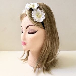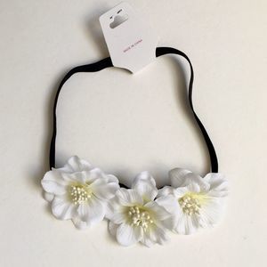NWT. White with pale yellow center and 3 dimensional pearlized centers. Black elastic band measuring approx. 19" around. Each flower measures approx 2 1/2" across, all 3 flowers together measure 7 inches across. Flowers are finished in felt for a soft, comfortable feel. Headband, crown, wreath. Floral, feminine, garden. Hippie, gypsy, boho. On trend.