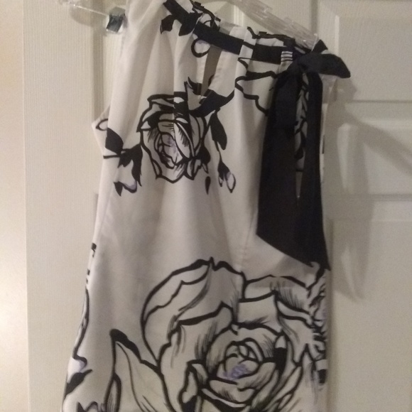 This top is a doll! Big black and white flowers with lavender accent. Black bow across the neck line ties on the side. I really love this one.