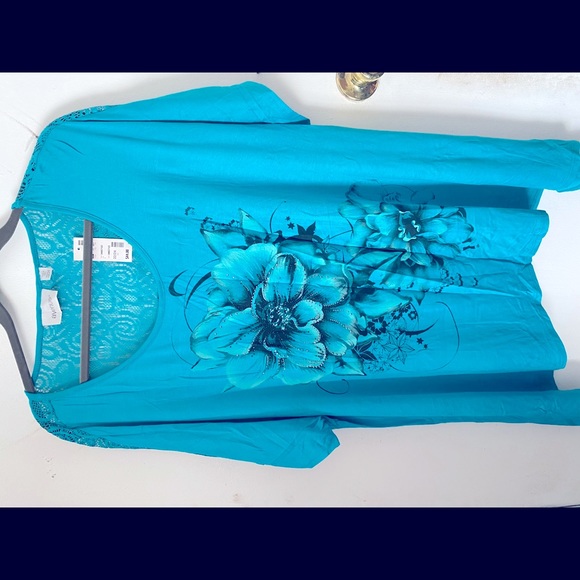Blue flower design top with some rhinestones on the flowers. It’s a shark bite style top so the sides of the shirt are slightly longer. New with tags