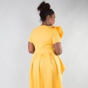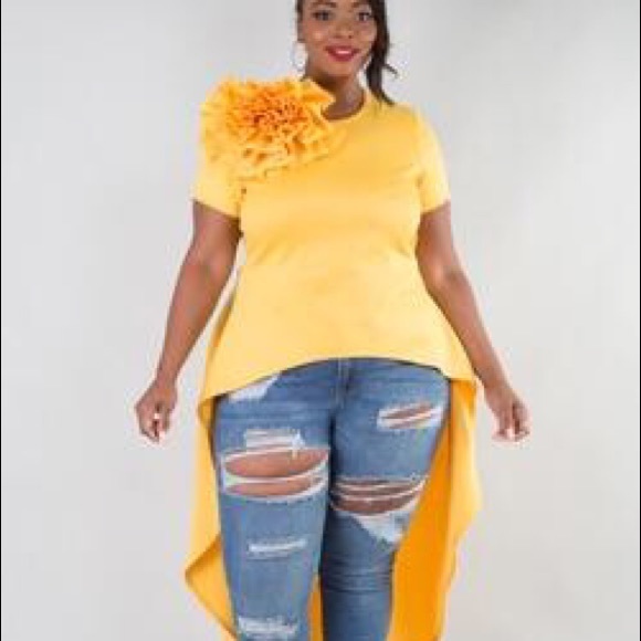 Plus size hi lo top is made of comfortable and flattering scuba material. Fitted bodice; round neckline; bold flower embellishment; pleated hi lo hemline.