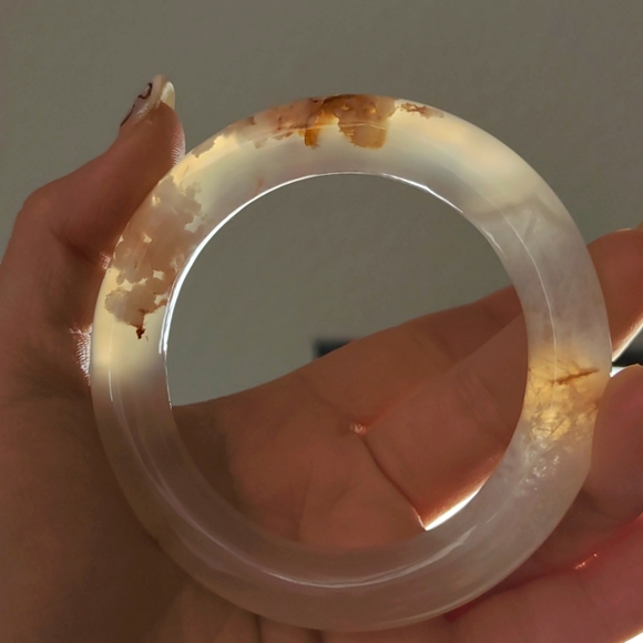 This beautiful flower agate bangle is one of a kind. The cherry blossom and the inclusion on this is just amazing. This is believed to stimulate the heart chakra, promoting emotional healing and helping us connect with our feelings of love and compassion. Wear this bangle and feel its power within you. This is made of real stone. New item.