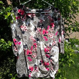 flower and Lace fabric top with scrunch on left side of the shirt for a super flattering look. Same scrunch detail on the sleeves. Three-quarter sleeves. Absolutely stunning and perfect for the summertime. It's light and comfortable!