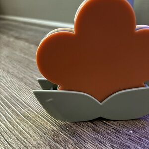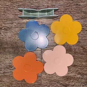 Flower coasters with leaf stand. Stand comes with slots for each coaster. Made of plastic. 2 minor flaws - one on orange coaster and one on leaf as pictured.