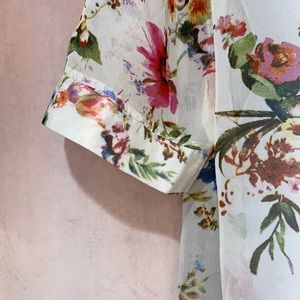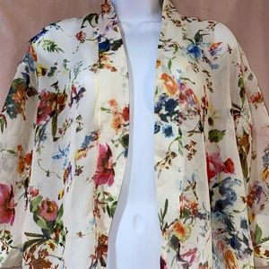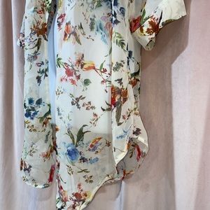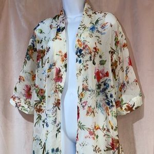 Cream colored cover-up with colored flowers all over it mid arm length goes to just about 4 Inches above your knee