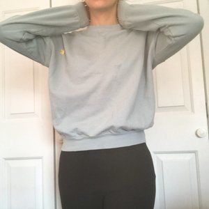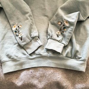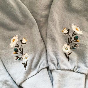 Pale blue sweater, very cozy and nice for going out or just hanging around the house. The sleeves have lovely embroidered flowers on them. Adding an elegant little touch to the whole thing. There’s also a little sun on the top left corner of the front of the sweater.