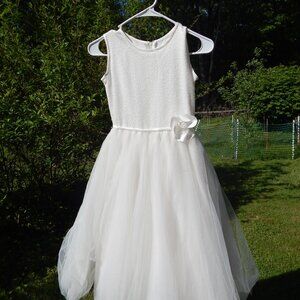 Beautiful off-white flower girl dress or other occasion. Small sequin bodice with small satin rosette on one side, with 7 layers of crinoline, a slip, 2 more layers of crinoline, and an interior slip. 11 layers total! Falls nicely with lots of poof. Sleeveless