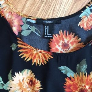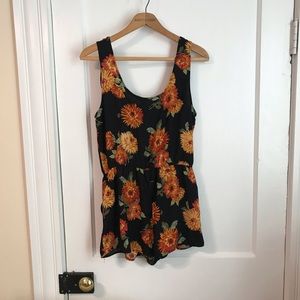 Super cute romper with orangey/ yellow flower pattern! Medium but runs smaller, the inseam on the shorts part is an inch and a half. 28 inches long, 18 inches pit to pit.