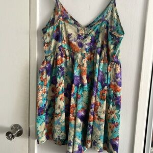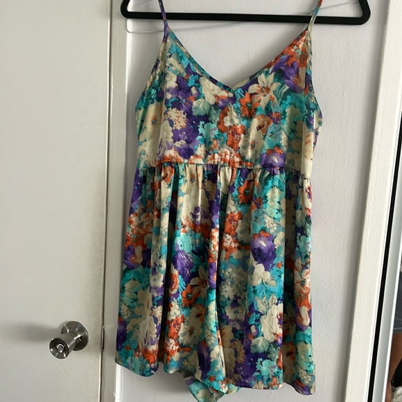 Cute summer style romper. Brand is Mika & Gala and purchased from LF. Size 10 but fits like Small/Medium with adjustable straps. Bright colors with blue, purple, and an orangish red. Material is silk-like