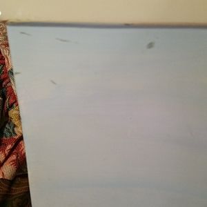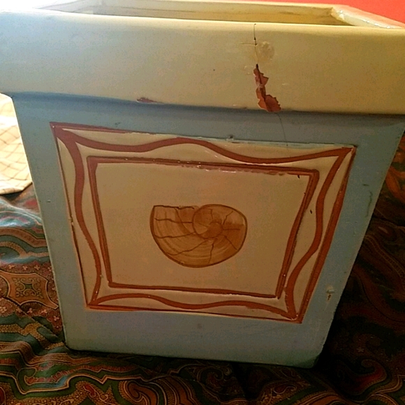 Pretty blue and white ceramic flower pot. Has a seashell on front. Has several chips and scratches. Can still hold a pretty flower or plant