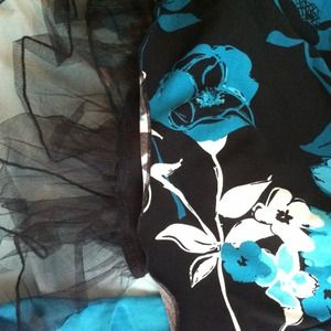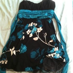 Black with white and different shades of teal flowers. Elegant with crinoline in the skirt of the dress. Perfect for a school dance or party!