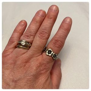 Silver flower ring with stretchy elastic band in back. Very cute and dainty. Measurements in photos. Price as marked