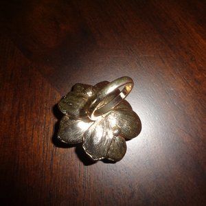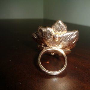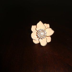 Beautiful flower ring with faux white pearl, surrounded by tiny crystals. It's in a great condition with very slight tarnishing on the band, that is hardly noticeable. It's very feminine and will stand out anytime you wear it.