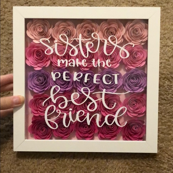 Handmade flowers in a shadow box. Makes the perfect gift. Ombré pink flowers with saying “‘Sisters make the perfect best friend” in a 9x9 white shadow box. Can personalize and make flowers any color. Message me to make a personalized order.
