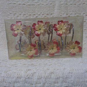 Set of 12 new shower curtain hooks in original packaging. The packaging says "hibiscus" but... In resin, probably hand painted in gold, rose, and cream.