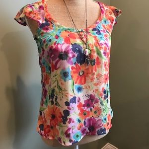 Flowering, lose fitting, ruffled shoulder tee, worn but in great condition