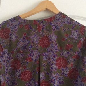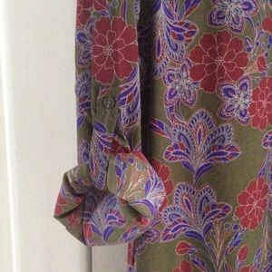 100% polyester flowy tunic dress with convertible sleeves and hi/ low length . Front length 31 3/4", back length 34 3/4", 1/2 bust 22 1/2". Has rounded side slits. Worn once only, in excellent condition.