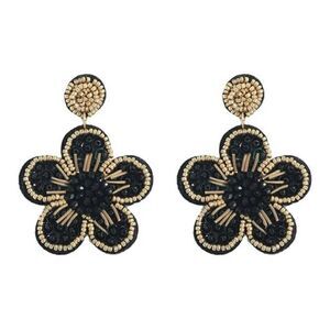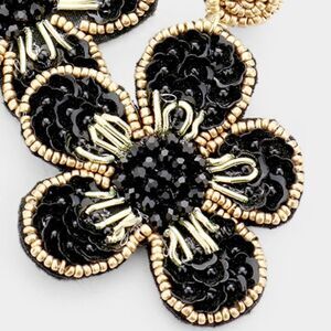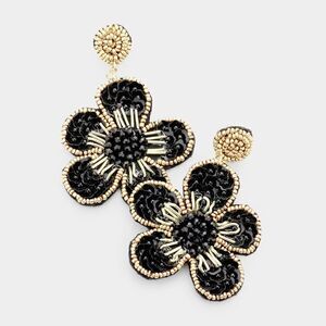 Flower Black Seed Bead Trim Dangle Earrings