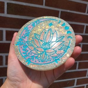 Made of Epoxy resin, blue acrylic paint, pink and coral pigment, golden glitter and white holographic glitter.