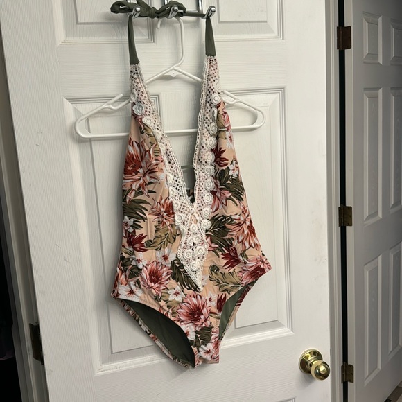 Flowered one piece swimsuit with plunging neck; cute lace detail and open circle back