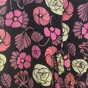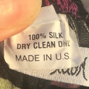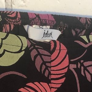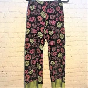 IDOM Silk lounge pants black with beautiful pink and green flowered print. Wide green band at ankle. Slim elasticized waist (3/4), no elastic in front. These are so comfortable and beautiful. In amazing condition. Picture #2 is exact color.