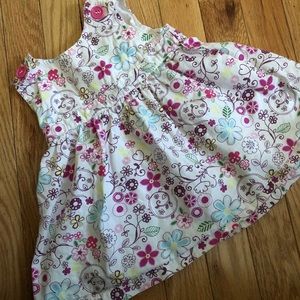 White sleeveless sundress with multi-colored various flowers; button shoulders; lined bodice