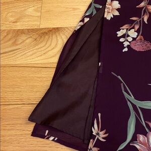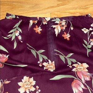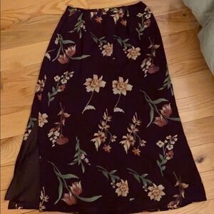 Lined skirt with floral pattern. Elastic on each side of waist and a zipper and button closure, slot on side, size 8, EUC
