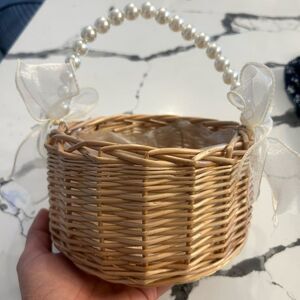 This elegant wicker basket features a stunning pearl handle, perfect for adding a touch of sophistication to your flower girl. The basket's natural tan color complements the white pearl accents beautifully.