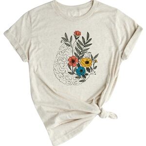 Heathered oatmeal mental health tee with a flowering brain graphic. No holes or stains. Comes from a smoke free and pet friendly home.