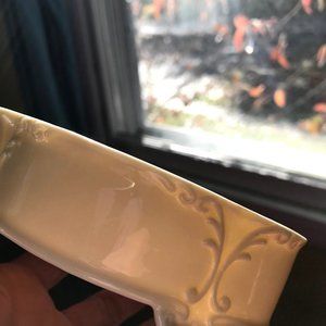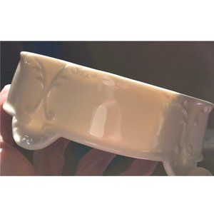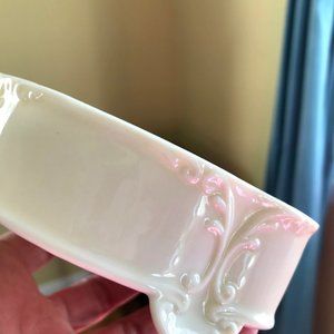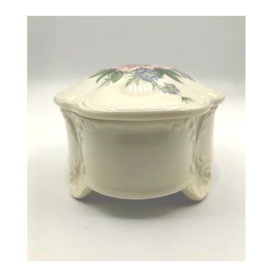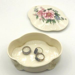 Gorgeous, translucent porcelain box with delicate, molded curled accents above each semi-circle foot. [NOTE: Rings *not* included.]The lid has a bouquet of peonies, asters and other flowers amid green leaves. Perfect to hold jewelry or any small items you don't want to lose.